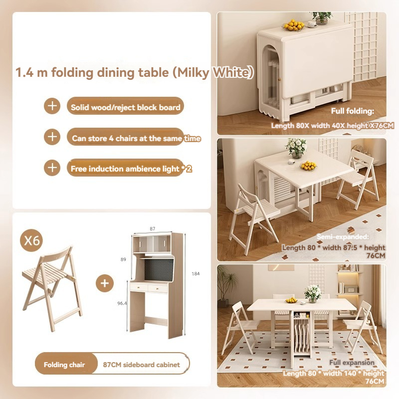 Full solid wood folding dining table, small unit, cream style, extendable rectangular dining table, multifunctional storage folding table