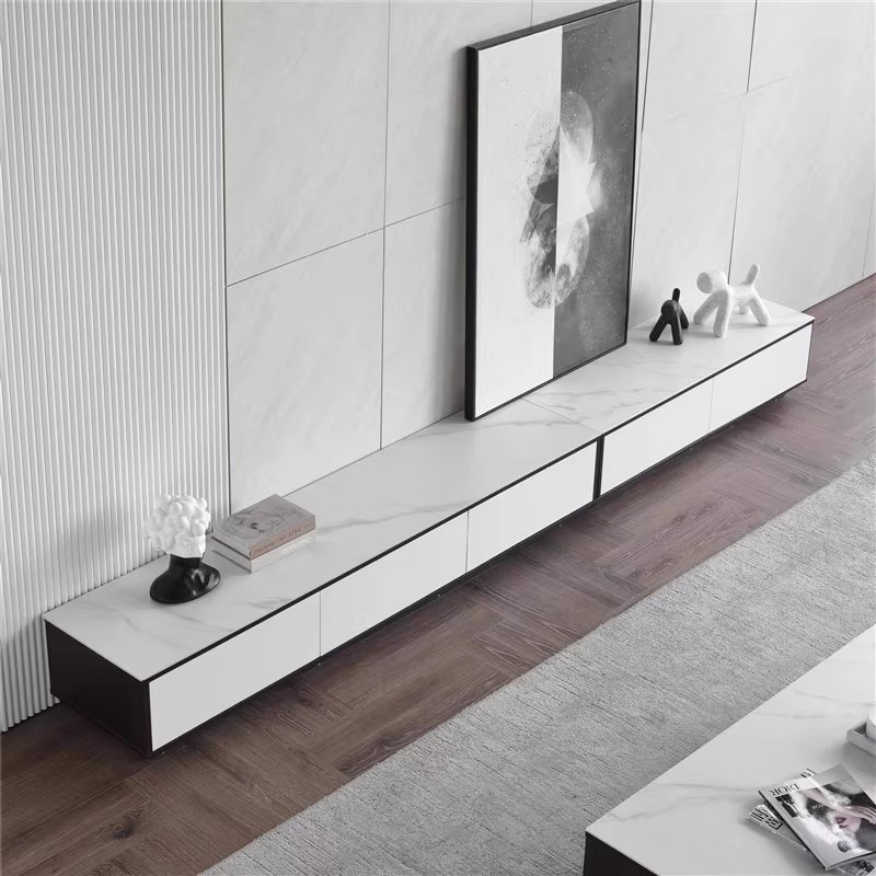 Material: Snow Mountain stone matte finish, equipped with push-to-open rails, E1 grade eco-friendly board with smoked leather veneer, white