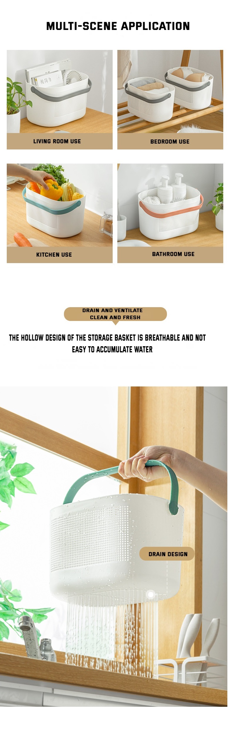 【Product size】: 30*18*19cm 【Product gross weight】: 355g 【Product Net Weight】: 350g [Introduction]: Multi-purpose storage baskets are made of high-quality PP material. Adapt to a variety of storage needs, can store fruits and vegetables, snacks, toys, toiletries, etc., convenient access. The hollow design is ventilated and stored, and the bottom drain design is dry and does not accumulate water. Thickened and widened handle for easy extraction and movement. Deepen the large capacity, easily store a variety of daily items, and keep the countertop clean and tidy. 【Precautions】: Do not get close to open flames; Do not drop heavily or from a high place to avoid damage to the product;