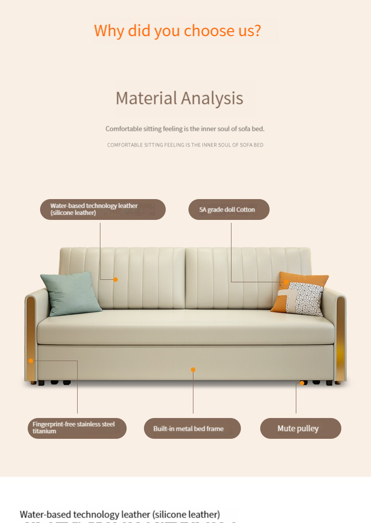 Introducing our Light Luxury Multifunctional Scratch Cloth Dual Purpose Sofa Bed – a foldable and versatile addition to modern living spaces. Crafted with a stainless steel frame and high elastic foam sponge filling, this sofa bed combines durability with comfort. The water-based technology leather (silicone leather) provides a minimalist and modern style.