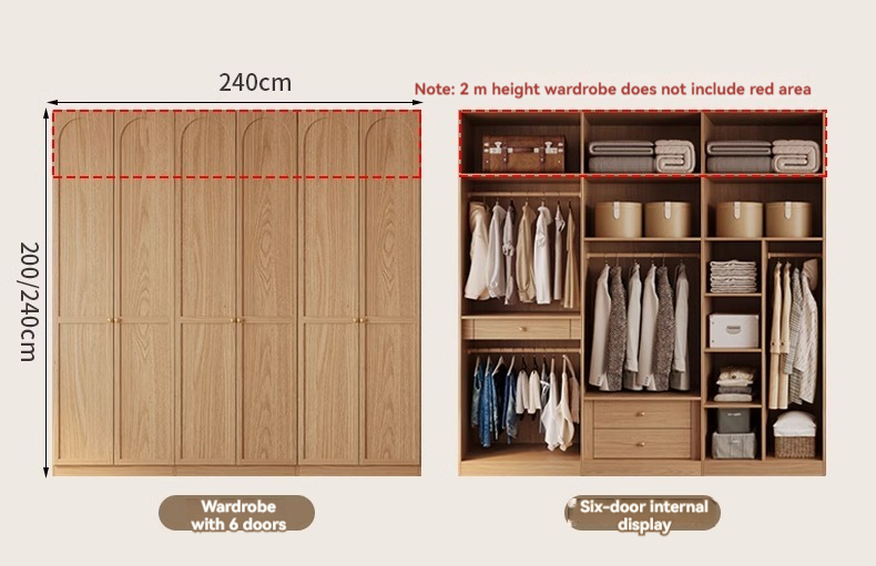 【 2.4-meter-high/18MM wooden core board 】 Six door wardrobe+with pull-out cabinet