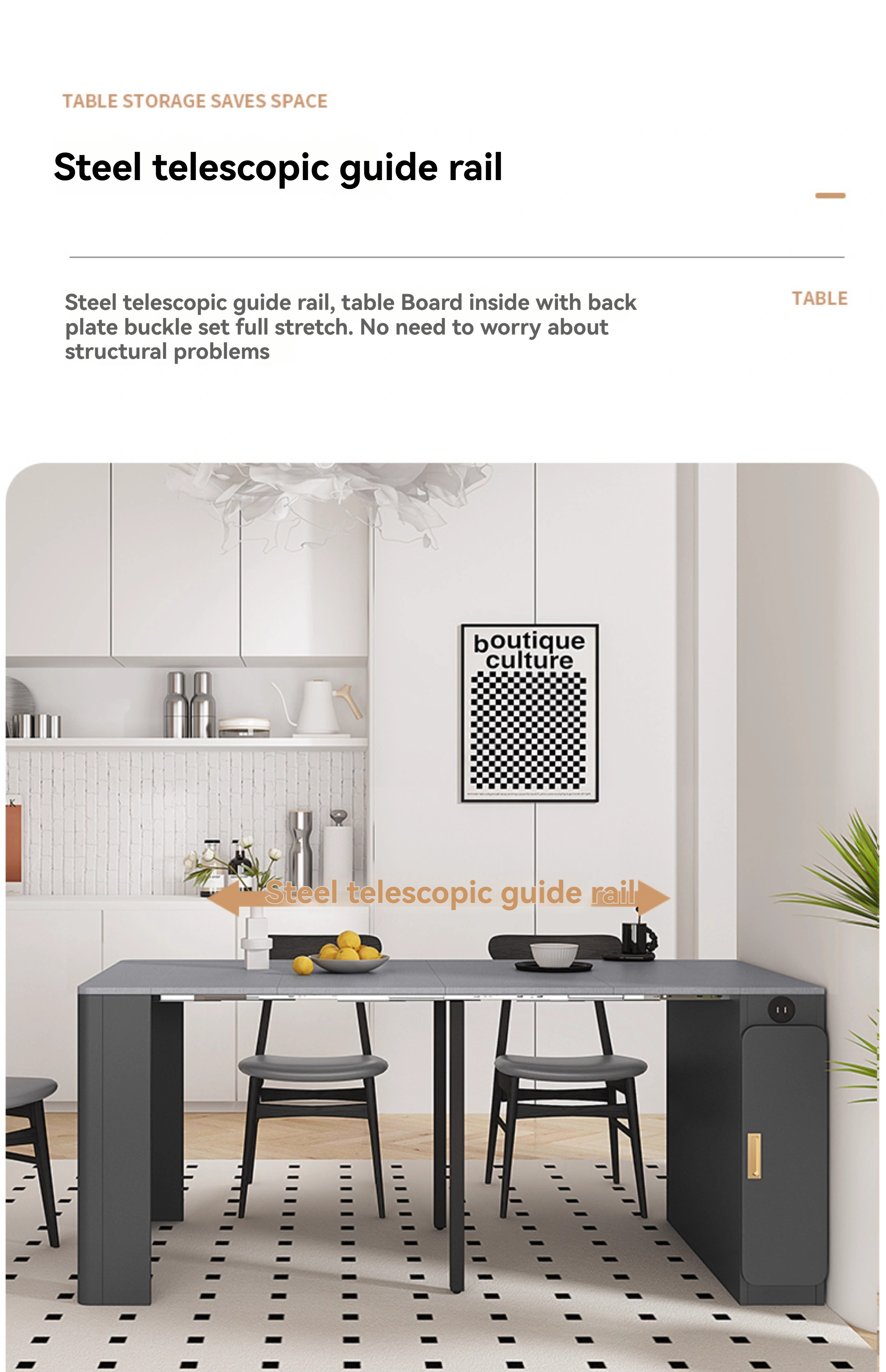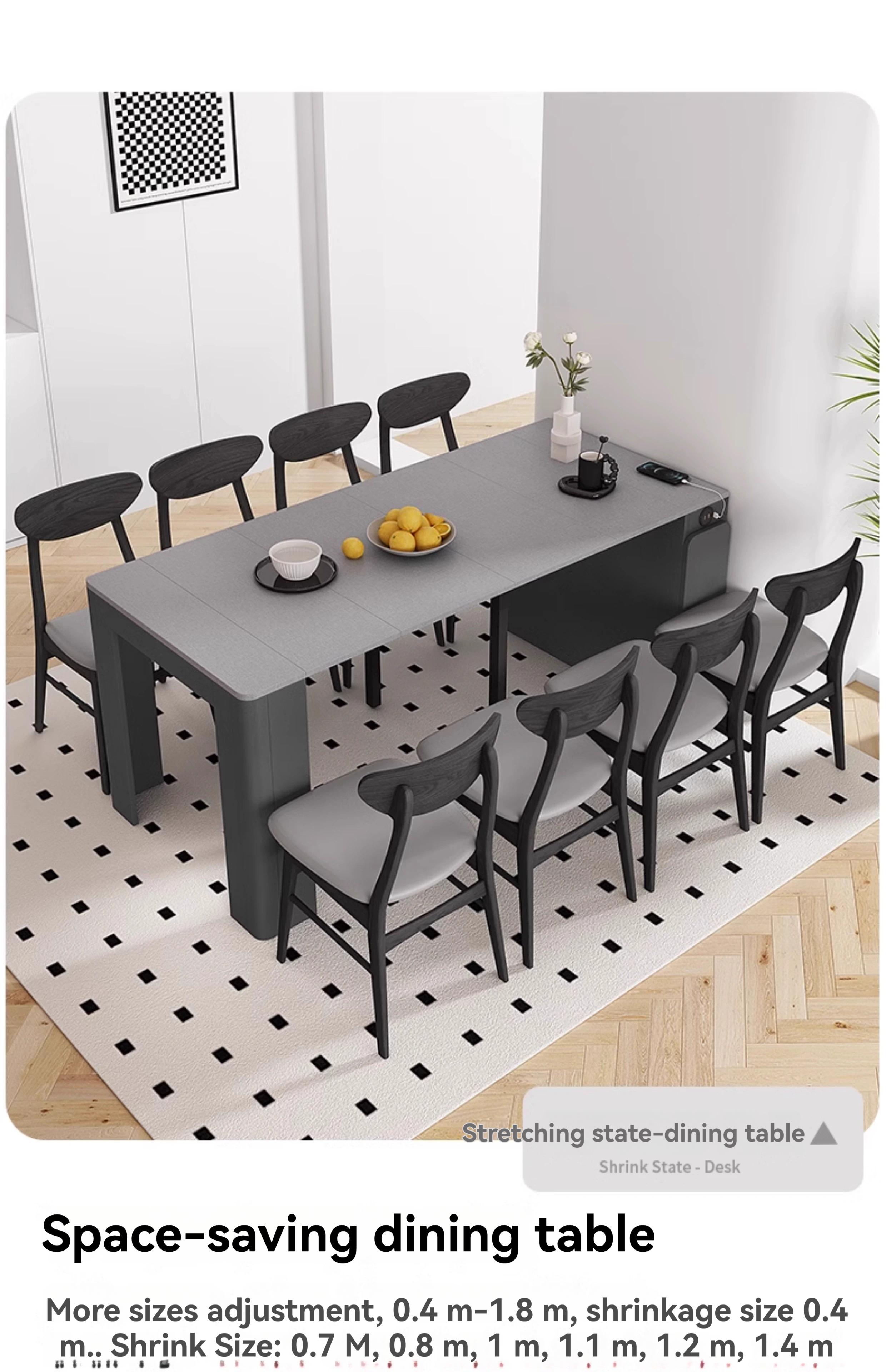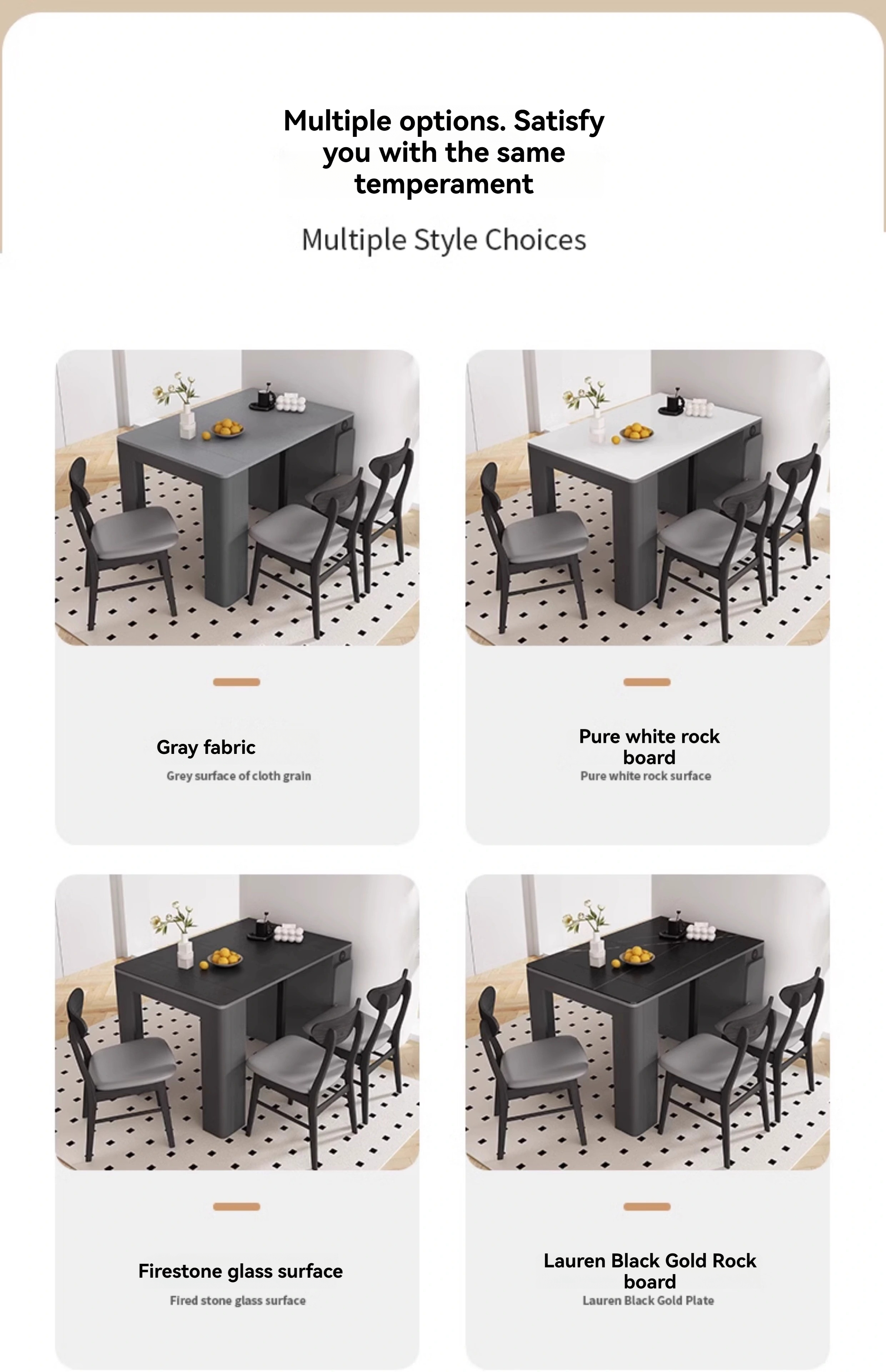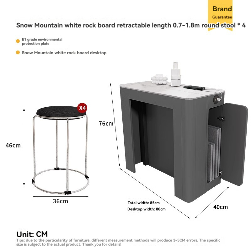 Color classification: [Cloth Gray Tabletop] Telescopic dining table 0.4-1.8 meters, [Cloth Gray Tabletop] Telescopic dining table+chairs * 2, [Cloth Gray Tabletop] Telescopic dining table+chairs * 4, [Cloth Gray Tabletop] Telescopic dining table+chairs * 6, [Pure White Rock Surface] Telescopic dining table 0.4-1.8 meters, [Pure White Rock Surface] Telescopic dining table+chairs * 2, [Pure White Rock Surface] Telescopic dining table+chairs * 4, [Pure White Rock Surface] Telescopic dining table+chairs * 6, [Snow Mountain White Rock Surface] Telescopic dining table 0.4-1.8 meters, [Snow Mountain White Rock Surface] Telescopic dining table+chairs * 2, [Snow Mountain White Rock Surface] 4 retractable dining tables and chairs, 6 retractable dining tables and chairs on the snow capped white rock surface, 0.4-1.8 meters retractable dining tables and chairs on the burnt stone glass surface, 2 retractable dining tables and chairs on the burnt stone glass surface, 4 retractable dining tables and chairs on the burnt stone glass surface, and 6 retractable dining tables and chairs on the burnt stone glass surface, 【 Lauren Black Gold Rock Surface 】 Telescopic dining table 0.4-1.8 meters, 【 Lauren Black Gold Rock Surface 】 Telescopic dining table+dining chair * 2, 【 Lauren Black Gold Rock Surface 】 Telescopic dining table+dining chair * 4, 【 Lauren Black Gold Rock Surface 】 Telescopic dining table+dining chair * 6, 【 Cloth Gray Table Surface 】 Telescopic dining table+round stool * 4, 【 Cloth Gray Table Surface 】 Telescopic dining table+round stool * 8, 【 Pure White Rock Surface 】 Telescopic dining table+round stool * 4, 【 Pure White Rock Surface 】 Telescopic dining table+round stool * 8, 【 Snow Mountain White Rock Surface 】 Telescopic dining table+round stool * 4, 【 Snow Mountain White Rock Surface 】 Telescopic dining table+round stool * 8, 【 Fire Stone Glass Surface 】 4 retractable dining tables and round stools, 8 retractable dining tables and round stools with burnt stone glass surface, 4 retractable dining tables and round stools with Lauren black gold rock surface, 8 retractable dining tables and round stools with Lauren black gold rock surface