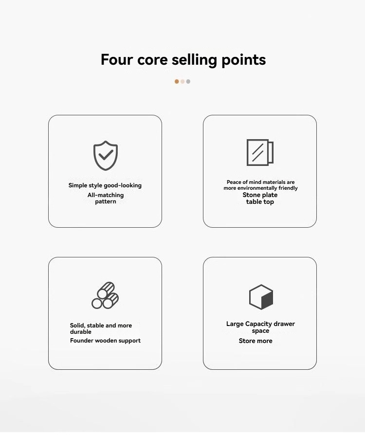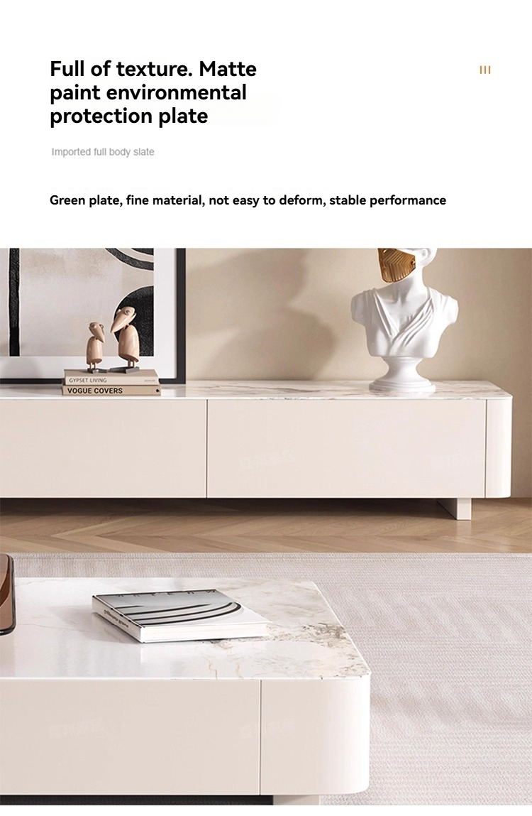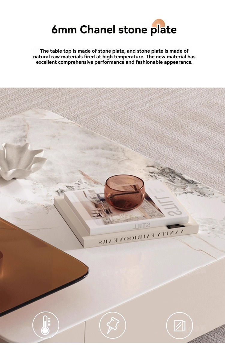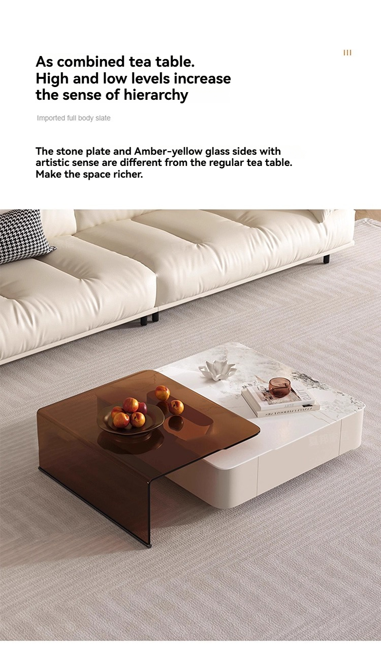 Style: Fashionable and minimalist Materials: Frame: Eco-friendly board with spray paint, solid wood drawers, tea-colored glass Tabletop: Stone slab Shape: Square Customizable: No Place of origin: Shunde District, Foshan City, Guangdong Province