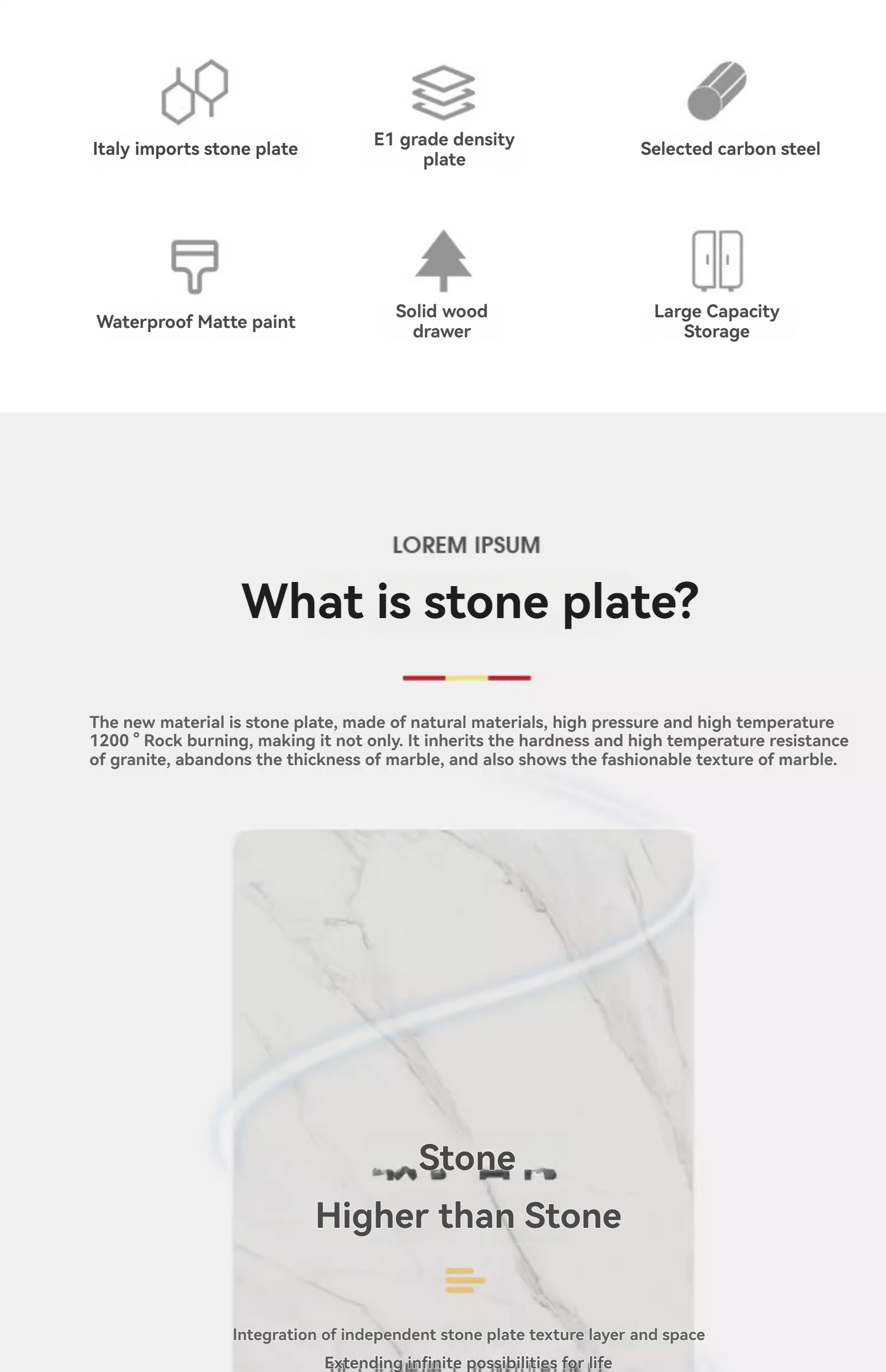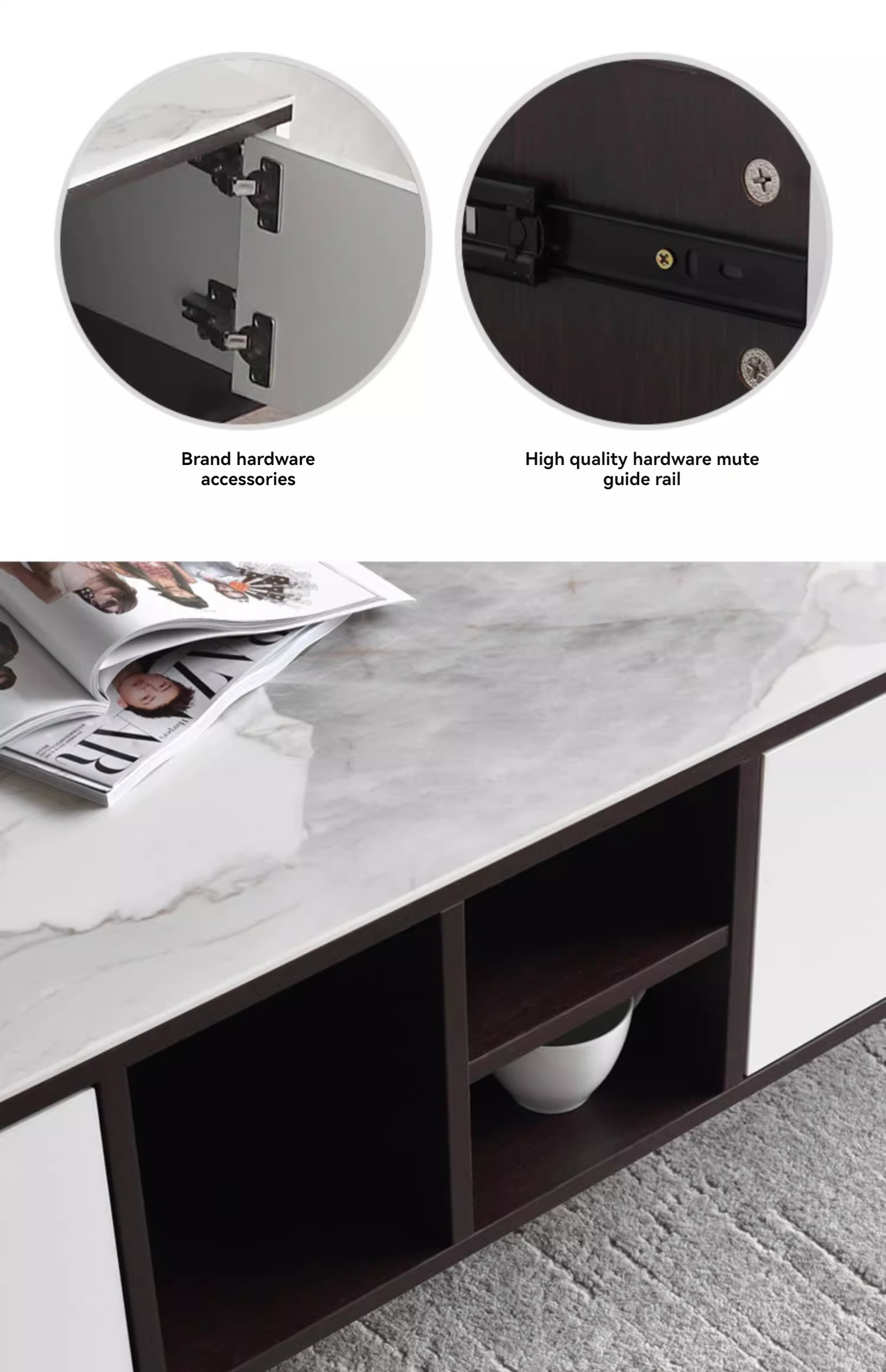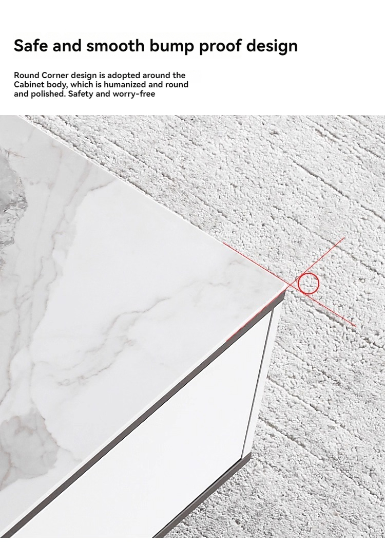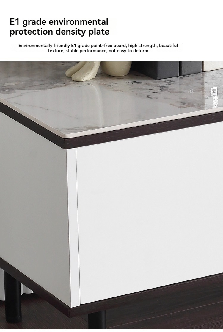 Material: Chanel high-gloss sintered stone, equipped with push-to-open rails, E1 grade eco-friendly board with smoked leather finish, white + hardware