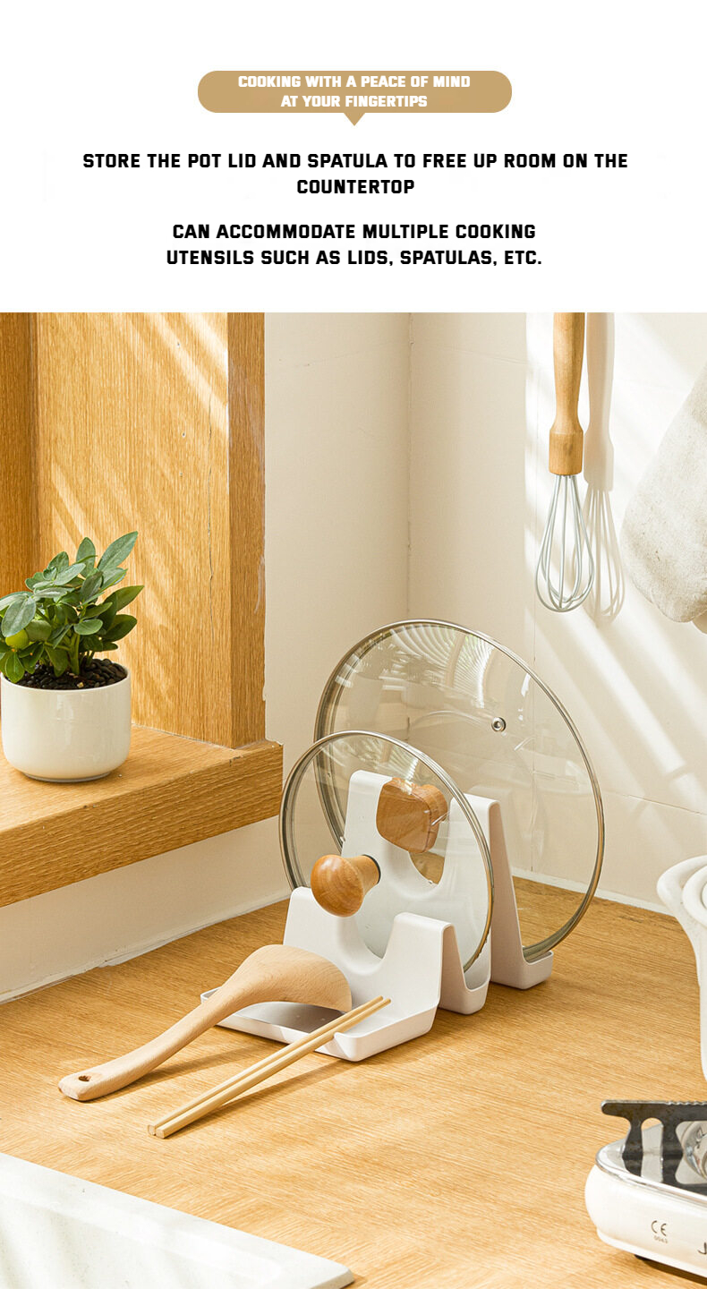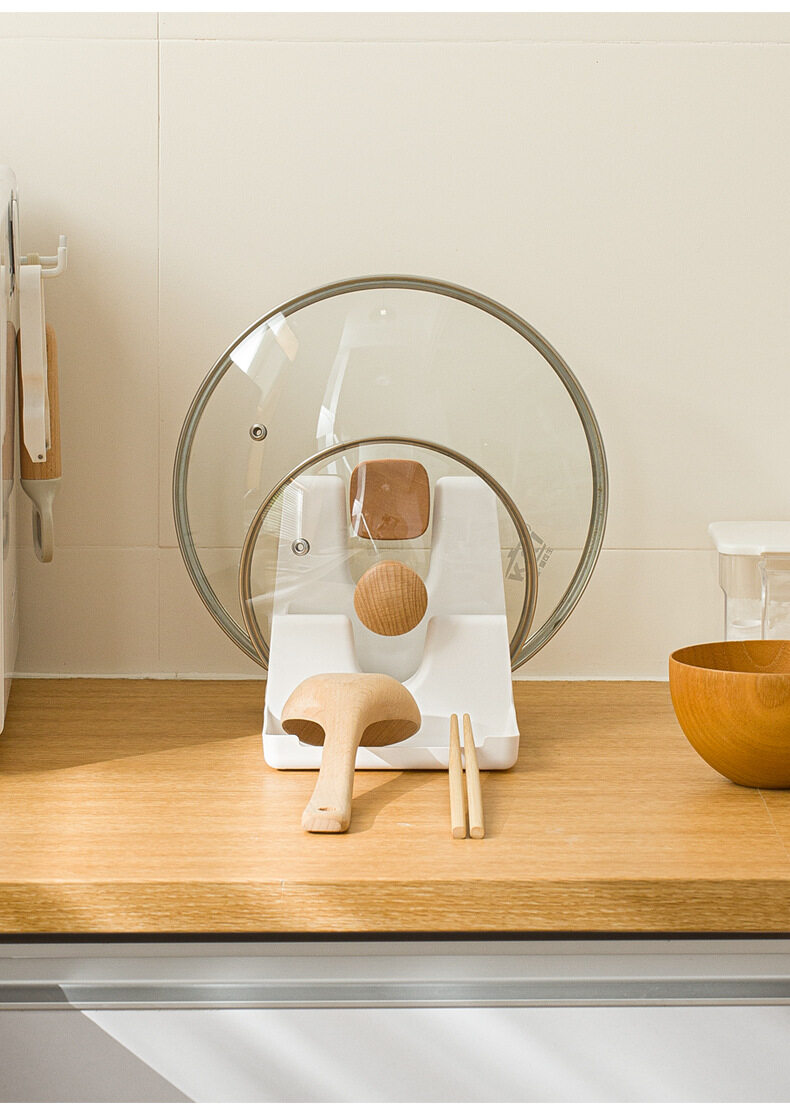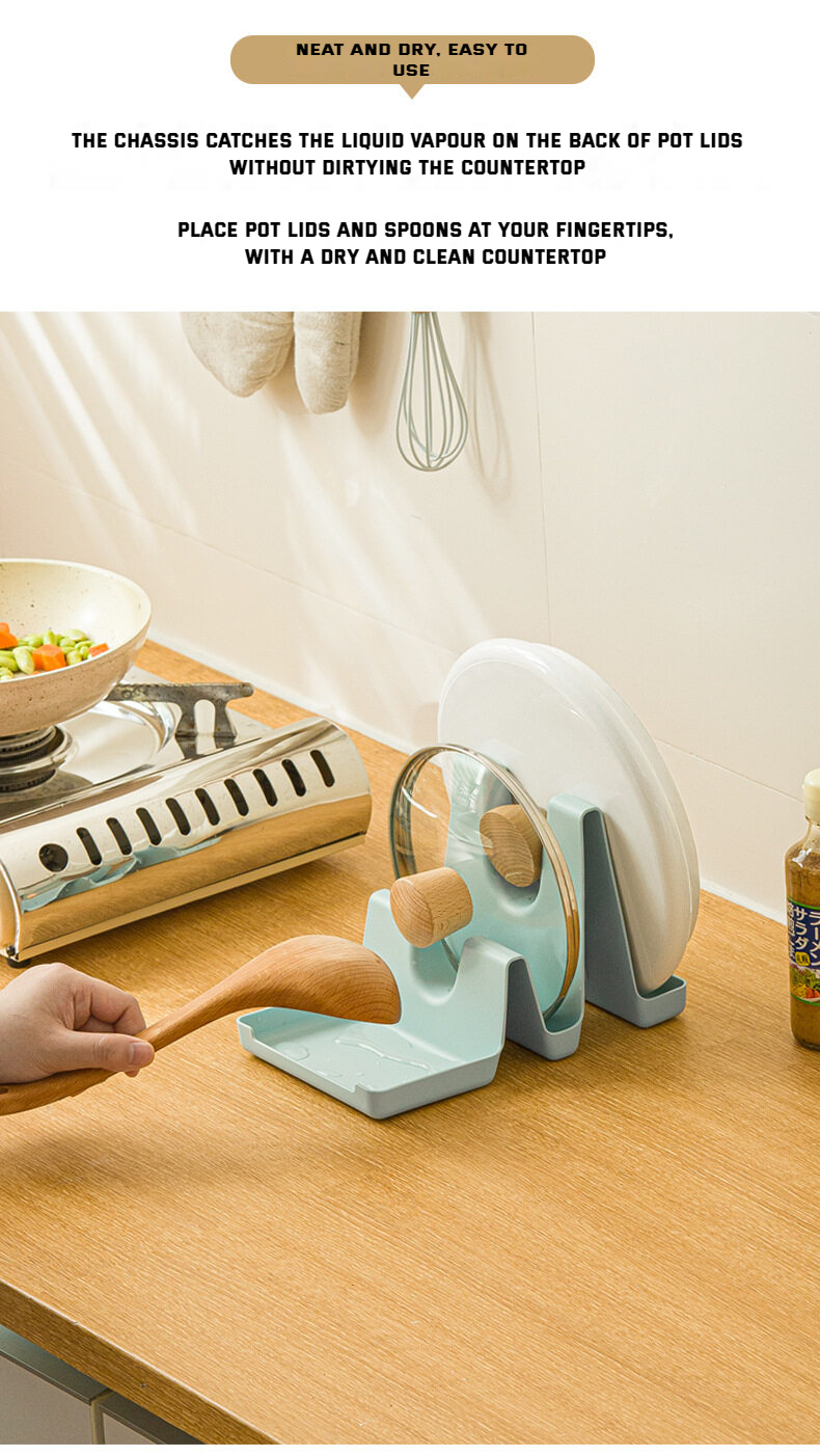 【Introduction】: The kitchen pot cover rack is made of high-quality PP material. At the same time, it can store pot lids, spatulas, etc., saving countertop space. The double-layer U-shaped bayonet can be placed on the lids of all sizes. The chassis catches water vapor and soup, and does not dirty the countertop.