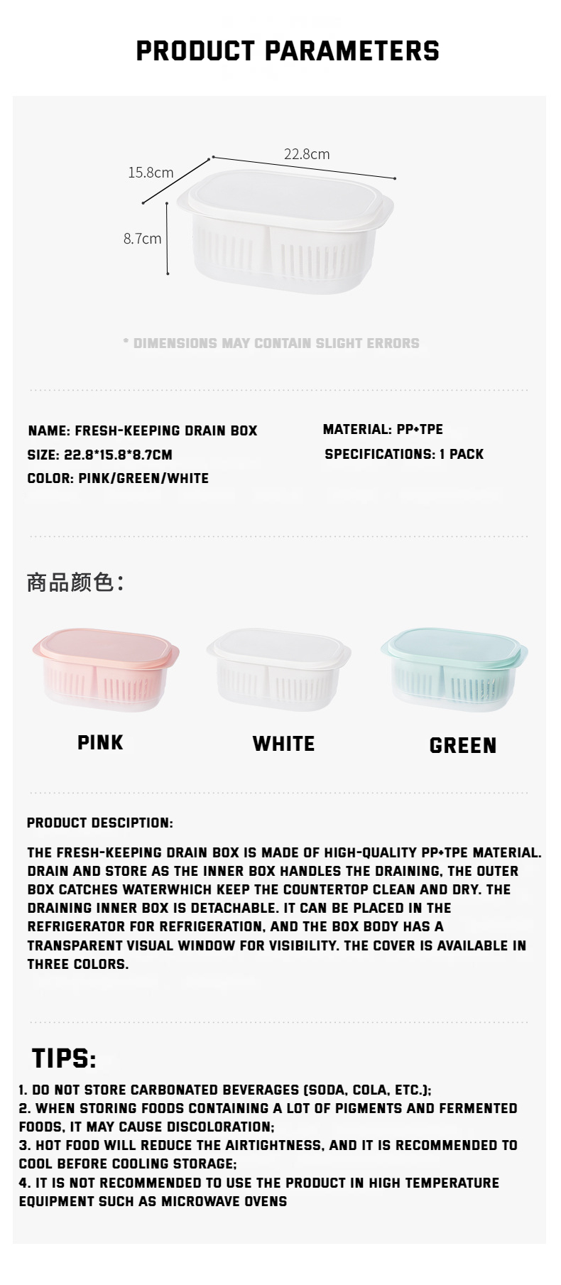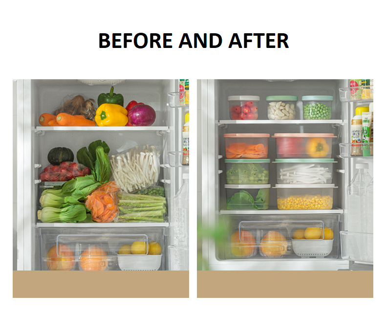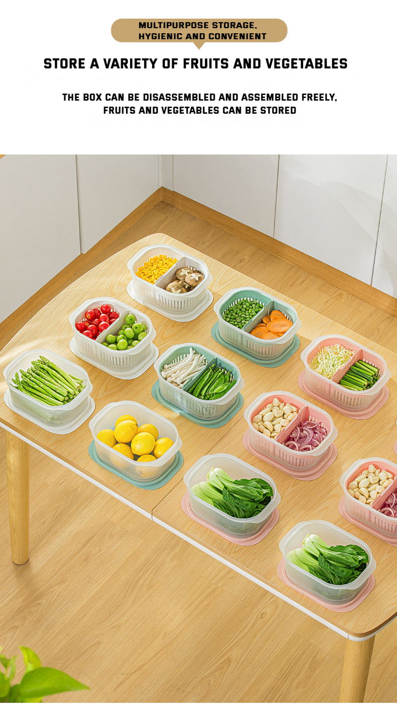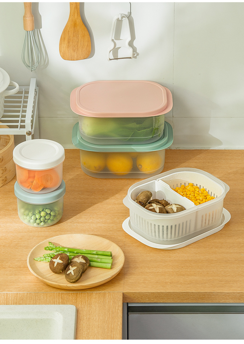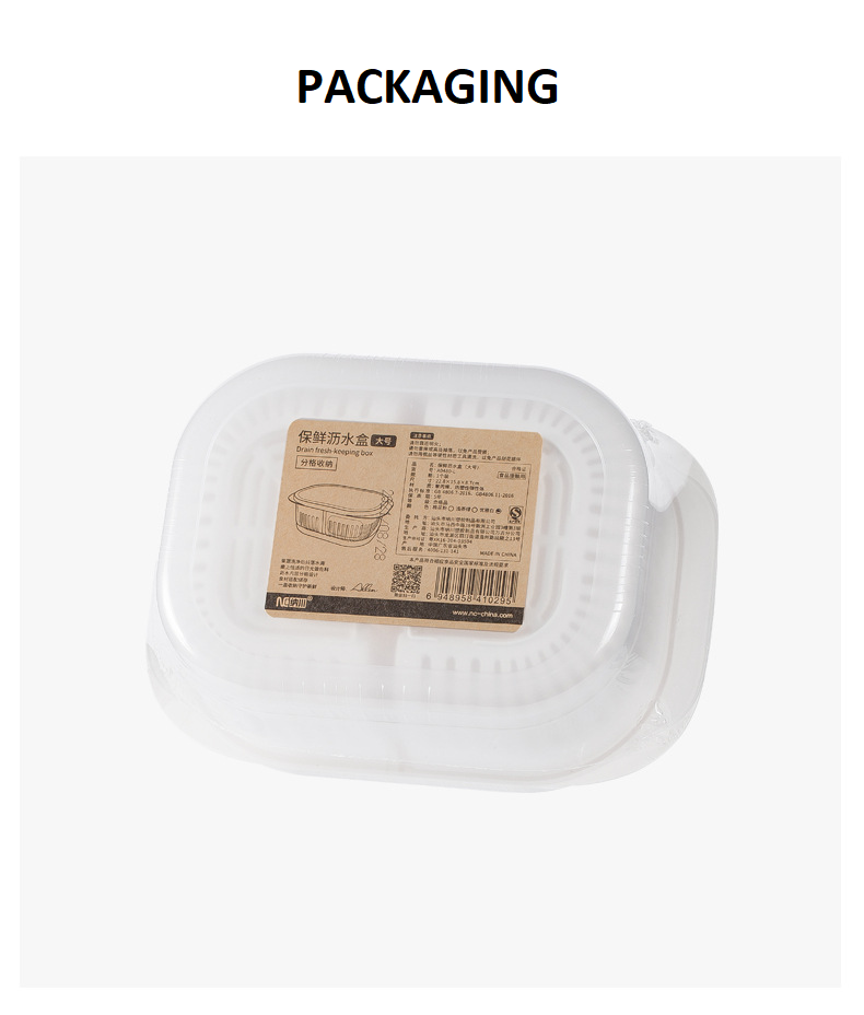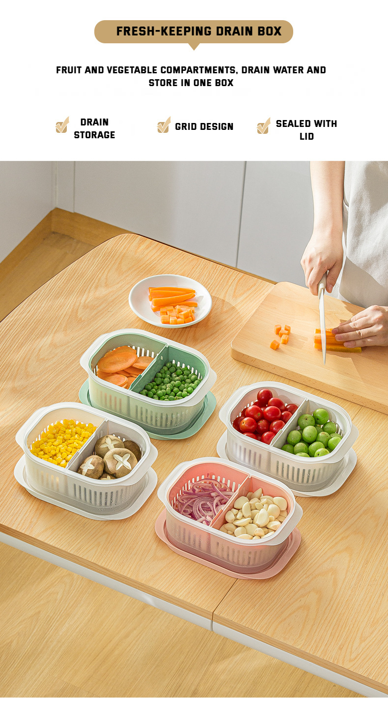 【Introduction】: The fresh-keeping drain box is made of high-quality PP+TPE material. Drain water to store a box for dual purposes, the inner box controls dry moisture, the outer box receives water, and the countertop is clean and dry. The draining inner box is detachable, and different ingredients are stored in separate compartments. TPE soft cover seals fresh, hygienic and odorless. It can be placed in the refrigerator for refrigeration, and the box body has a transparent visual window, so the items are clear at a glance. The cover is available in three colors, which is convenient for distinguishing storage items, which is considerate and convenient.