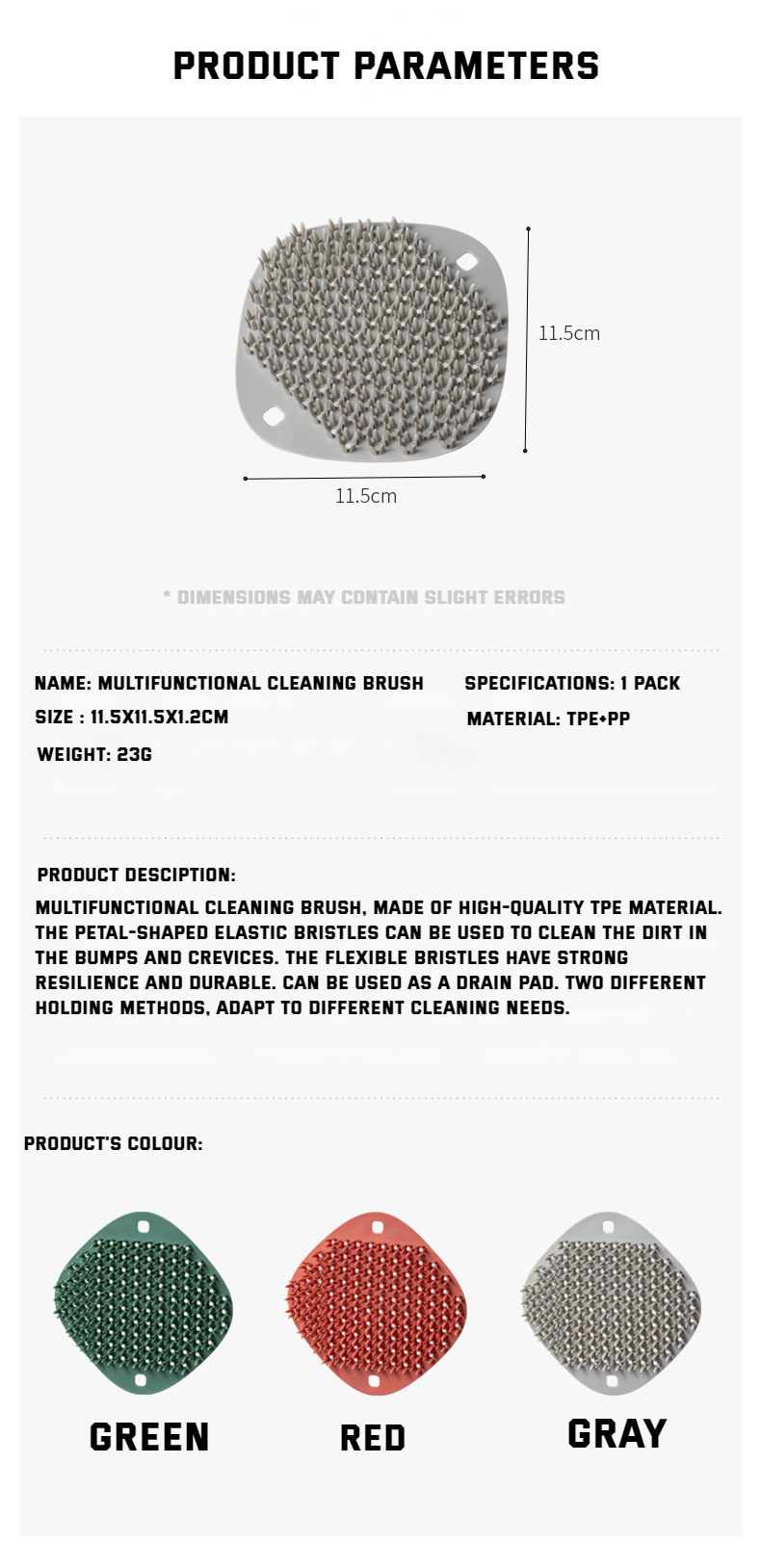 【Introduction】: Multifunctional cleaning brush, made of high-quality TPE and PP materials. Petal-shaped silicone bristles for cleaning