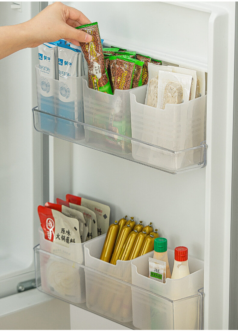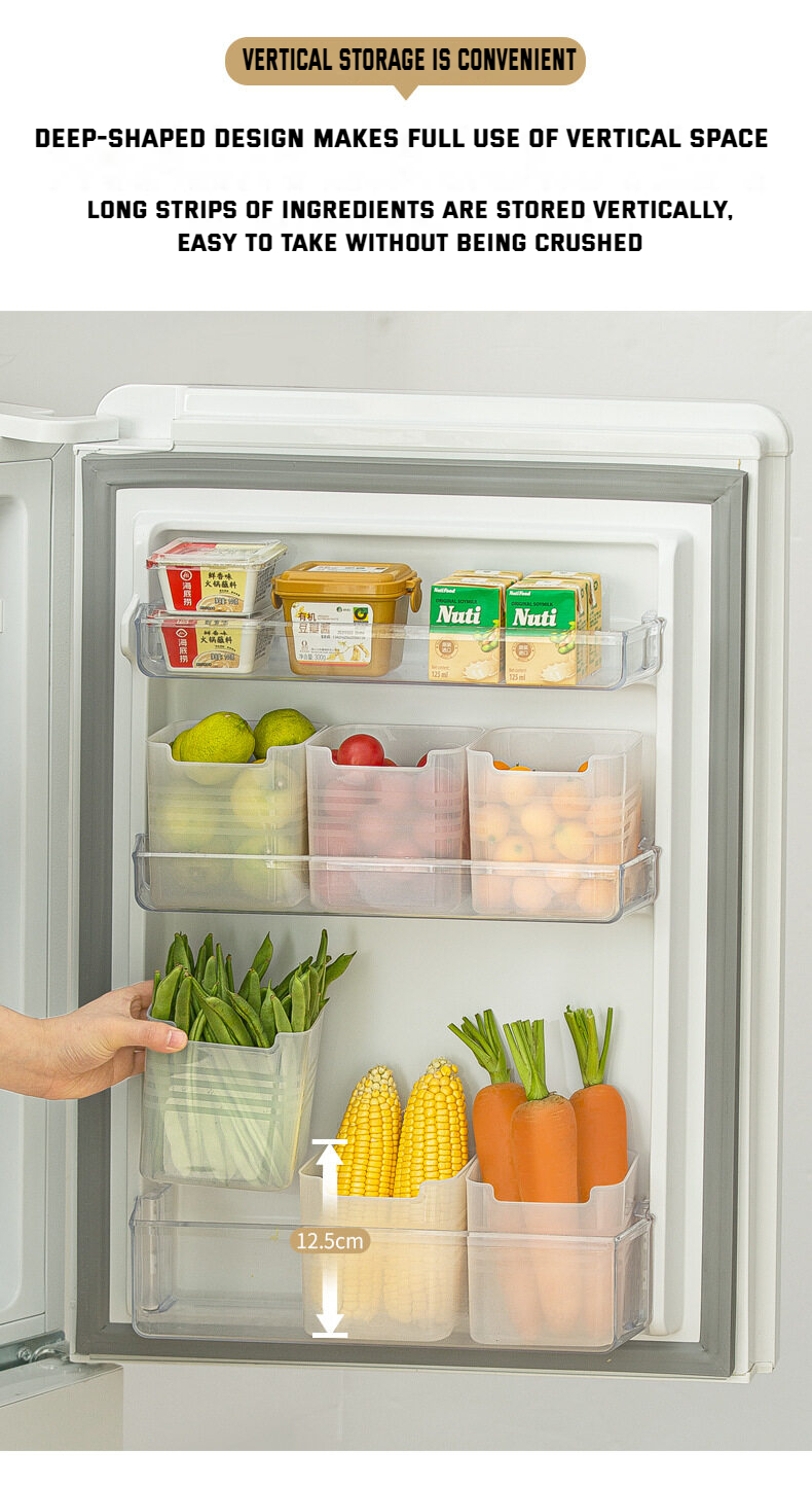 【Introduction】: The refrigerator side door storage box is made of high-quality PP material. Sort and store refrigerator door items and place them upright without wasting space. Safe material, can be in direct contact with food. The transparent box body is clear at a glance, and items are easy to find. The deep-shaped design makes full use of the vertical space, and the long-shaped ingredients are stored vertically, which is easy to take without being crushed. Classified storage of various shapes of condiments, neat and not toppling, refrigerator space in good order.