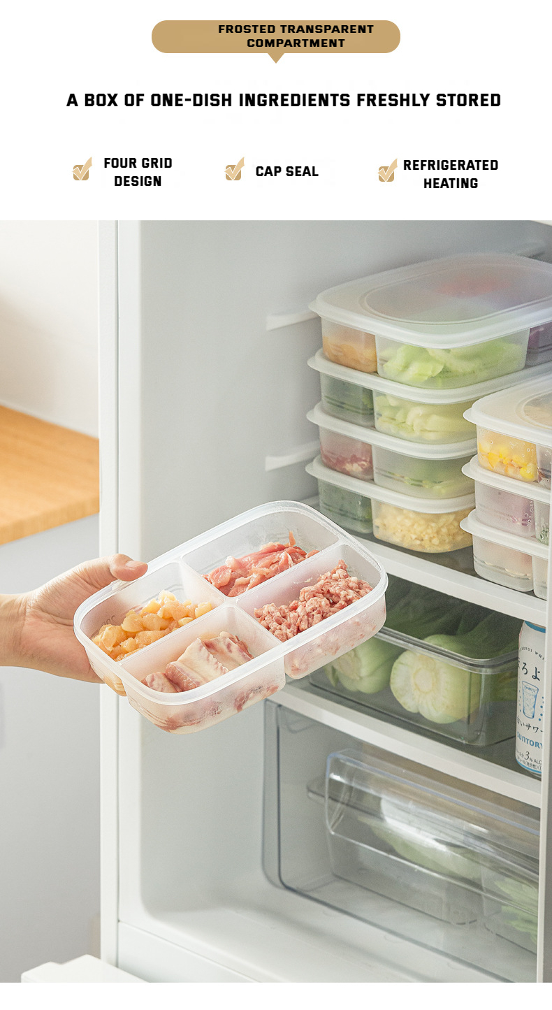 【Introduction】: The compartmentalized fresh-keeping box is made of high-quality PP material. 4 compartments, store different types of ingredients, and prepare dishes without worry. The capacity of a single cell is 200ML, which can be eaten in one cell at a time. Sealed with lid, refrigerated storage without smell. Low temperature resistance -20 ℃, can be frozen in the refrigerator to keep fresh. Microwave heating does not deform, can be used as a lunch box. The top cover has a deepened groove, and the multi-layers are stably stacked to save space. One box is multi-purpose, snacks are not easy to deteriorate, quantitative storage, and enjoy a healthy life.