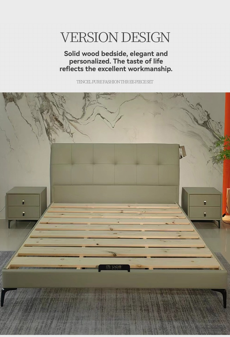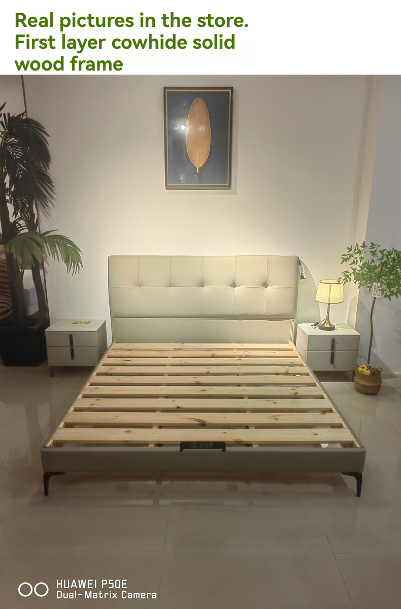 Waffle top layer cowhide bed modern simple minimalist solid wood soft leather bed master bedroom