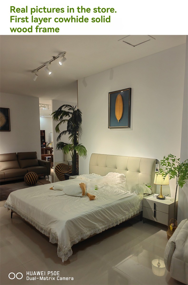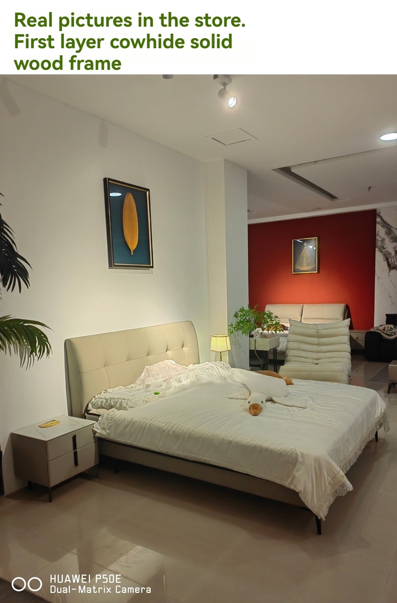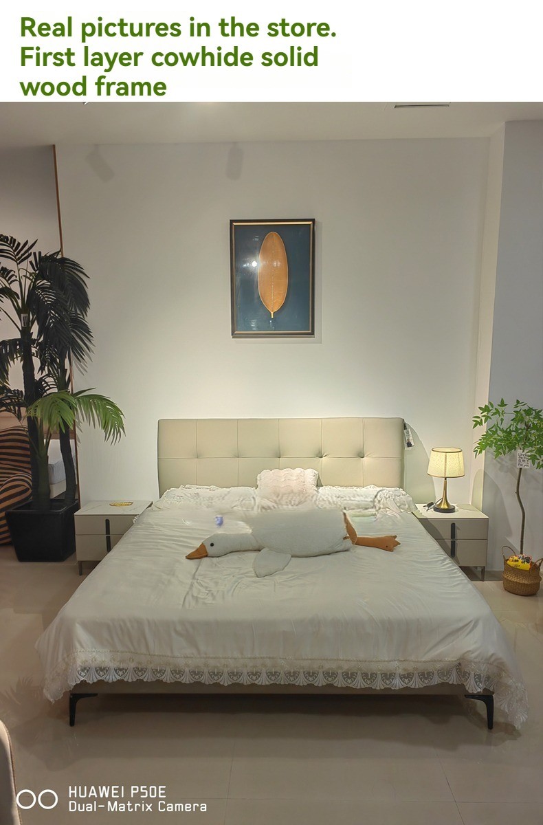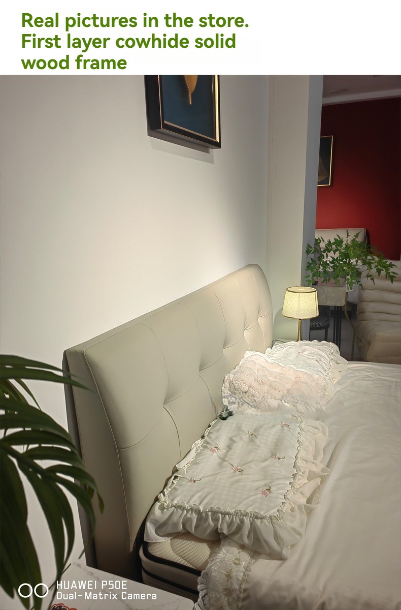 Waffle top layer cowhide bed modern simple minimalist solid wood soft leather bed master bedroom Waffle top layer cowhide bed modern simple minimalist solid wood soft leather bed master bedroom
