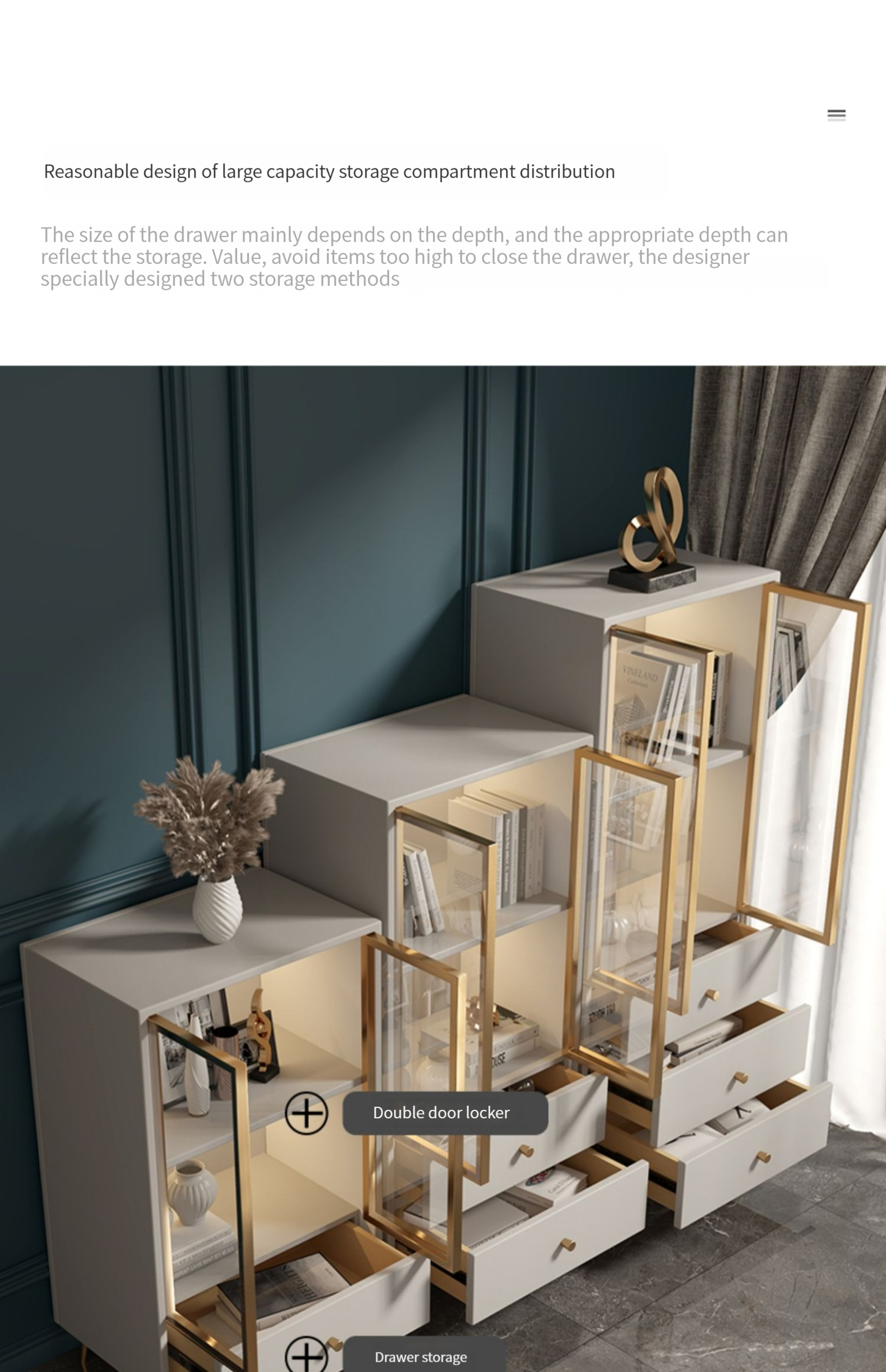 Single drawer cabinet, double drawer cabinet, and triple drawer cabinet, pure white color, with light.